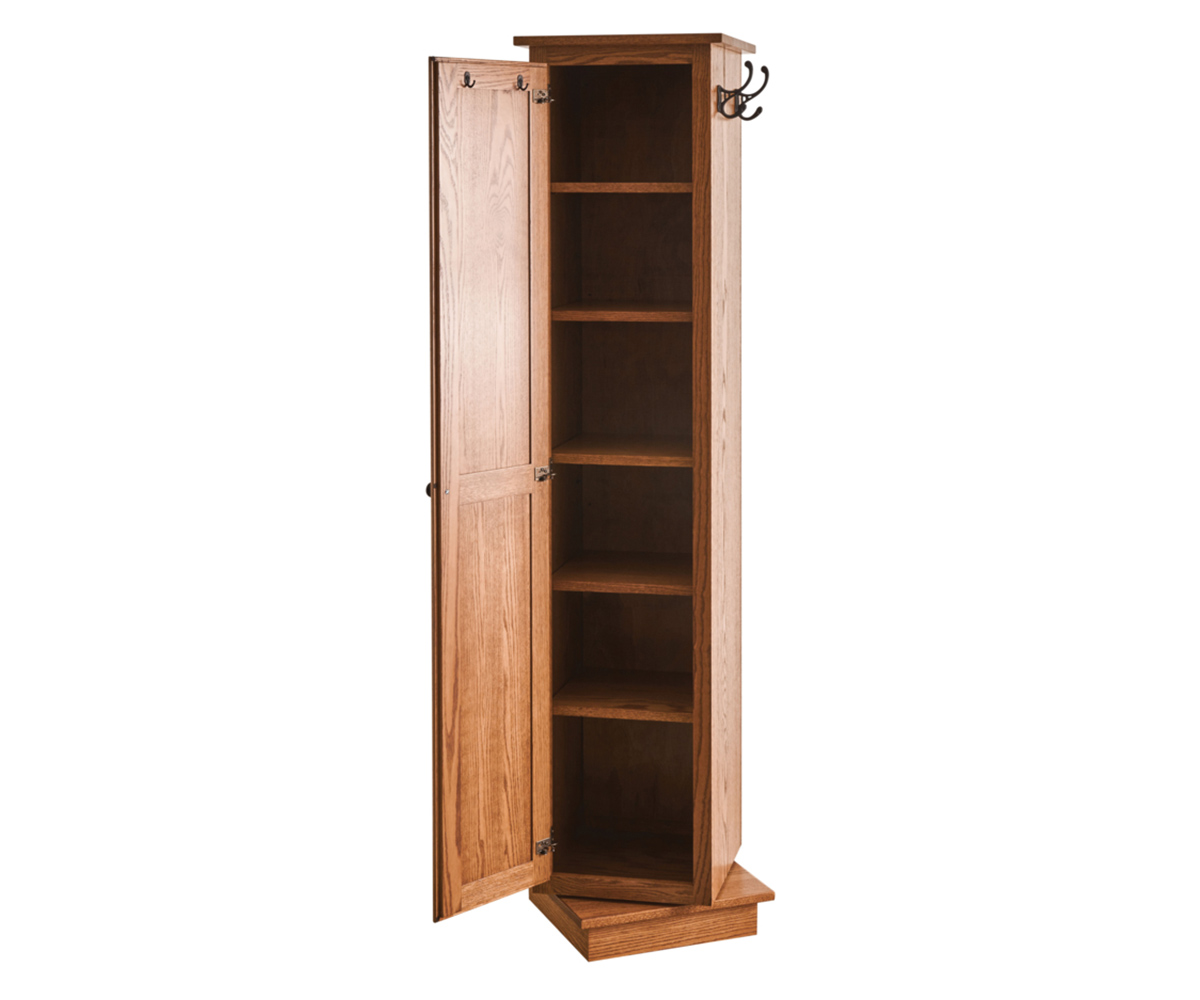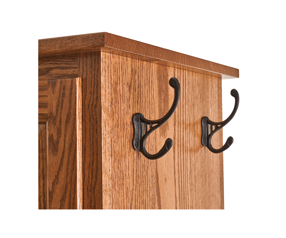 Features: • Mirror on one side • Door on the back • Small hooks behind door • Five wood shelves behind door • Large hooks on opposite sides